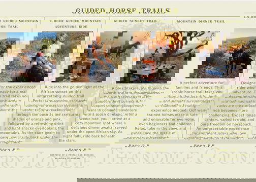 A breathtaking ride through the bush and into the mountains as the sun begins to set. This guided trail is perfect for couples or small groups who want to combine adventure with a touch of magic. After a scenic ride, you’ll arrive at a cozy mountain spot where a delicious dinner awaits. Served under the open African sky. As night falls, ride back beneath the stars, surrounded by the sounds of nature. An unforgettable evening of connection, freedom and pure beauty.