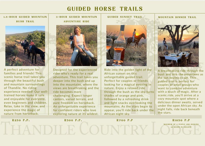 A perfect adventure for families and friends! This scenic horse trail takes you through the beautiful bush and mountain surroundings of Thandile. No riding experience needed! our well-trained horses make it safe and enjoyable for everyone, even beginners and children. Relax, take in the view, and experience the magic of nature from horseback. Young riders between 4 and 10 years old are warmly welcome to join our trails. For their safety and comfort, an additional guide will accompany them free of charge